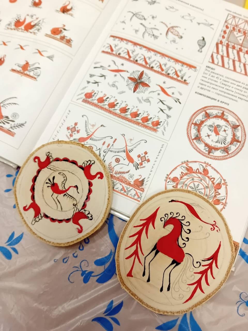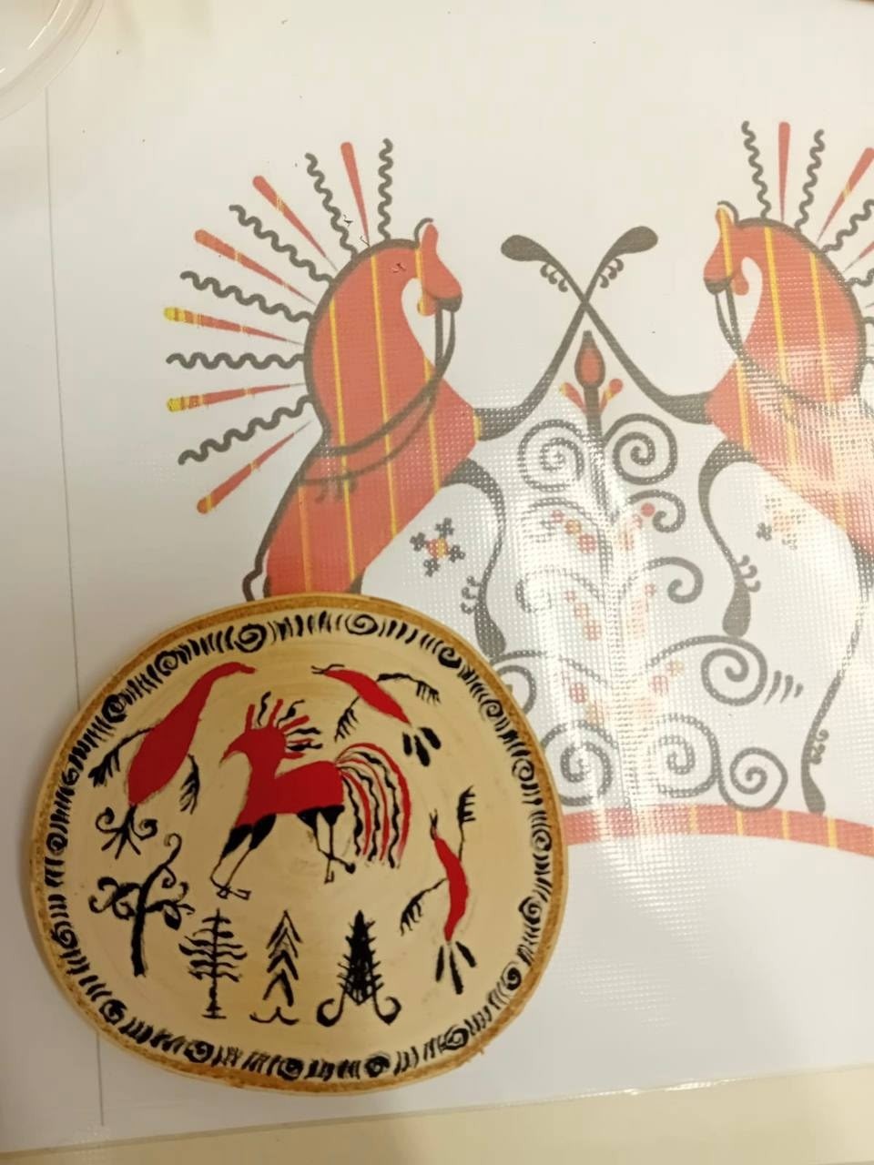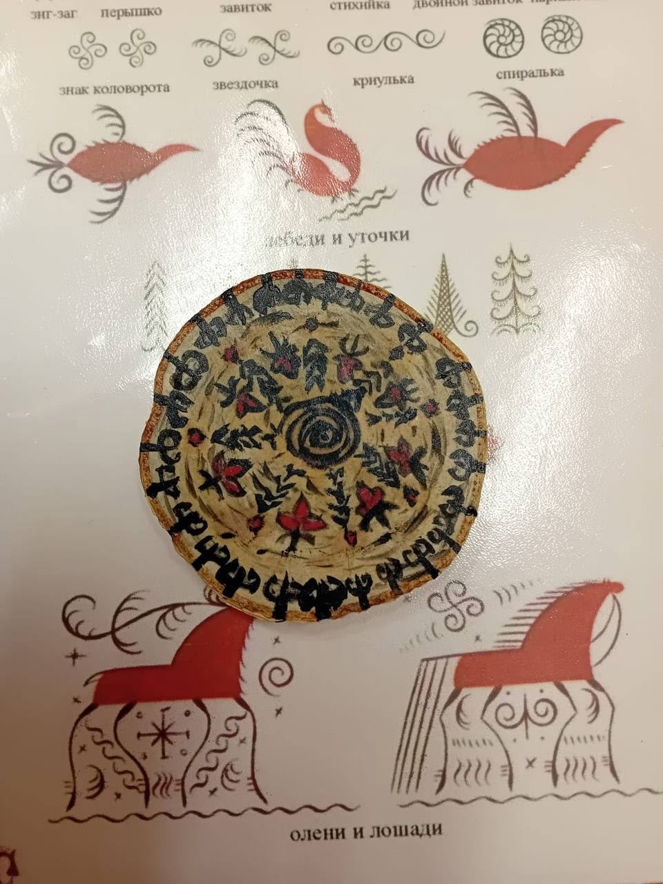 Главные герои росписи — олени и кони. Красный конь — это солнце. Несколько коней, следующих друг за другом, — путь светила по небу. Елка символизирует мужское начало. Каждый элемент здесь — часть рассказа, пожелания или оберега для близких.