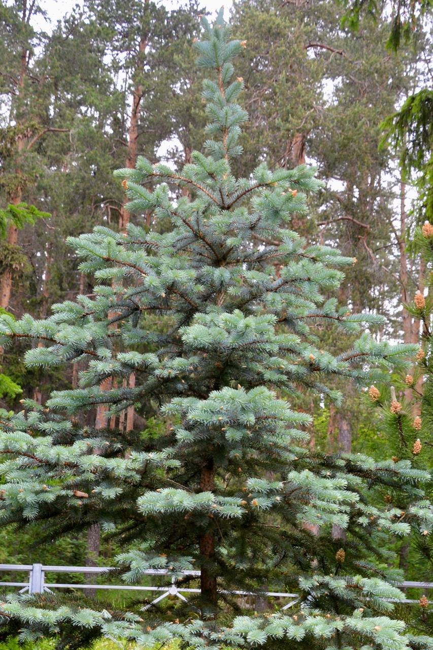 Хвоинки длиной 15—30 мм, ромбической формы в сечении. Цвет — от серовато-зелёного до ярко-голубого.