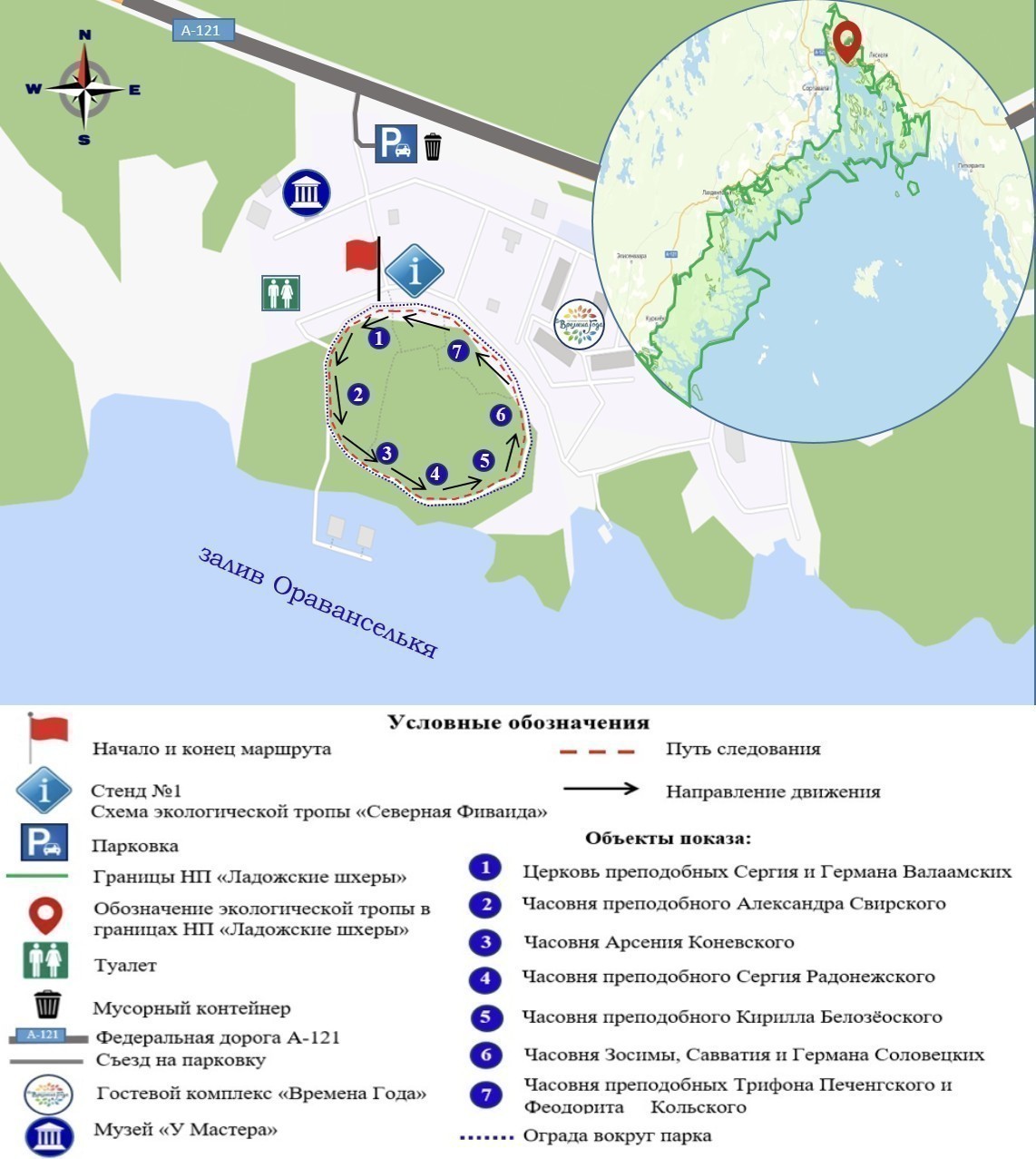 В начале маршрута имеется входной информационный стенд. На маршруте имеются стенды, указатели навигации по маршруту, ограждения.