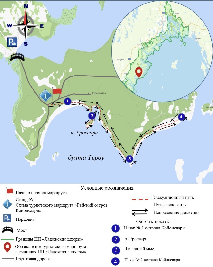 Туристский маршрут протяжённостью 3 км знакомит туристов с природой острова Койонсаари. Посещение маршрута позволит туристу познакомится с флорой и фауной «Национального парка «Ладожские шхеры», понаблюдать за птицами в их естественной среде обитания, увидеть песчаные пляжи, красивые мхи и лишайники, неприступные скалы.