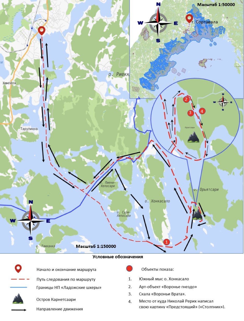 Водный туристский маршрут протяженностью около 40 км знакомит посетителей с уникальным геологическим и природным объектом - островом Каарнетсаари. Небольшой остров Каарнетсаари находится к юго-западу от большого острова Орьятсаари. Несмотря на свои небольшие размеры, он является одним из самых известных островов в национальном парке «Ладожские шхеры». Главной достопримечательностью на острове Каарнетсаари является скала Вороньи Врата. На финском языке «каагеп» означает «ворон». К ней очень удобно приблизиться, если вы плывете на моторной лодке с южной части острова Ханкосало.